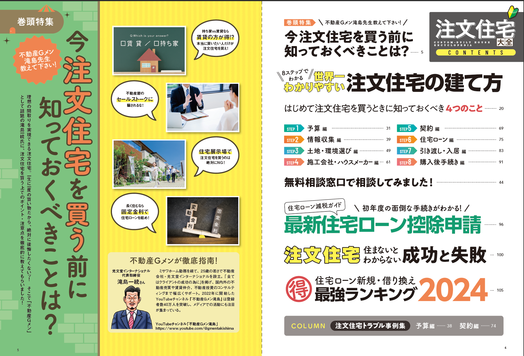 - 巻頭特集「今注文住宅を買う前に知っておくべきことは?」 YouTubeでも人気の「不動産Gメン」こと、不動産会社社長の滝島氏が、現在家を買うべきタイミングなのか、何に気を付けるべきなのか、わかりやすい漫画も織り交ぜながら解説しています。